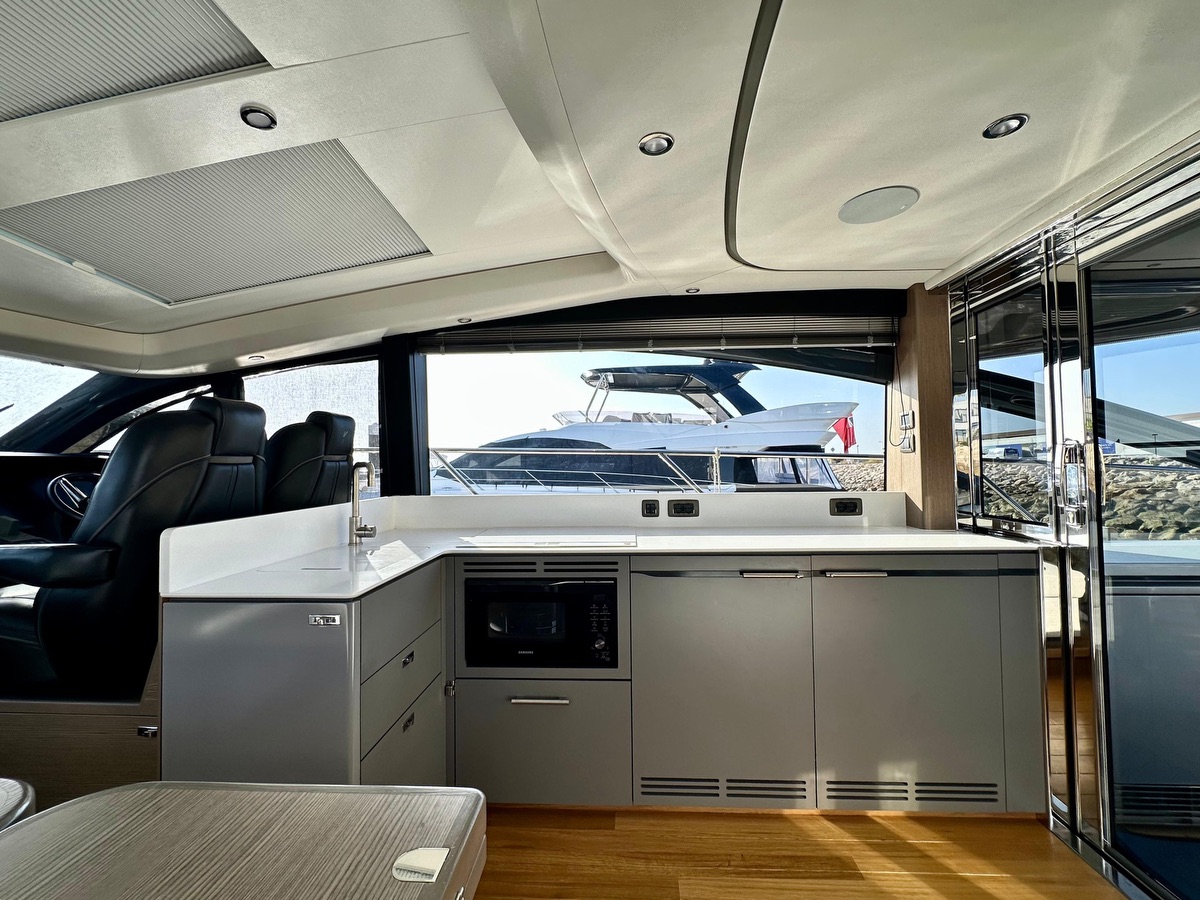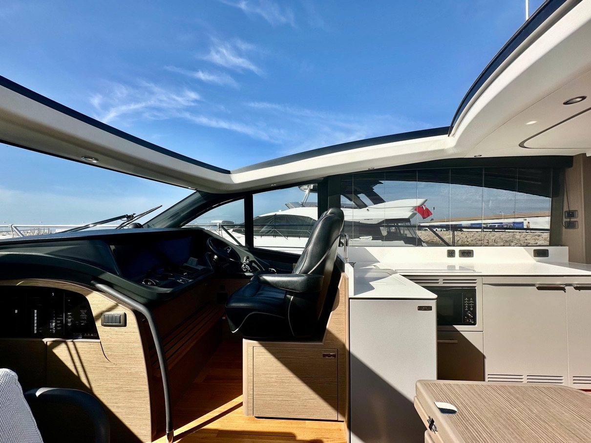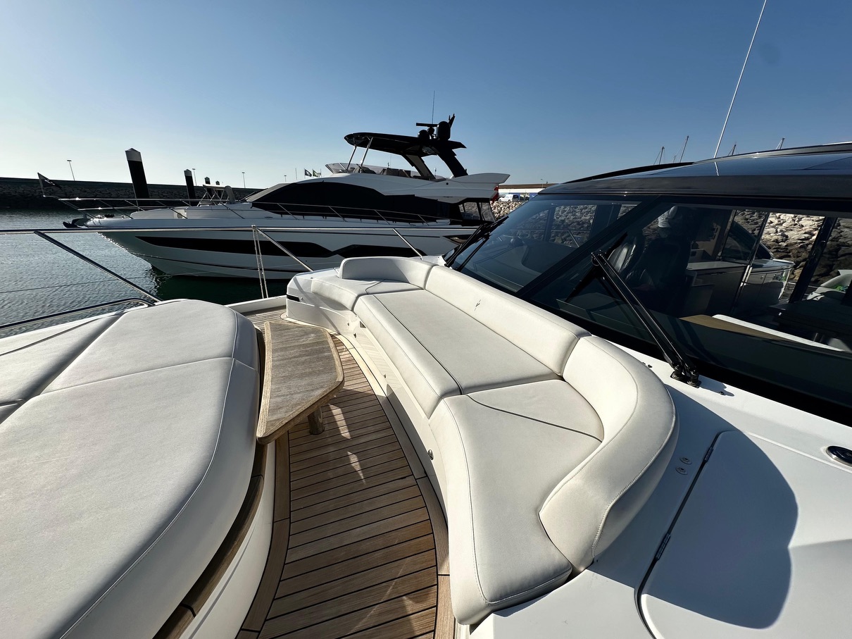 Clearly distinct of the V Class range are the clear sweeping lines, accentuated by the panoramic knife-shaped hull windows drawing in natural light and opening the interior out to the world around. The dynamic profile of the V55 conceals a spacious interior, perfect for relaxing or making longer journeys in supreme comfort. Access to the interior is via the hydraulic bathing platform, leading to a teak deck which runs throughout the living area. The cockpit connects to the main saloon via a cleverly concealed drop-down sliding patio door, seamlessly integrating both living areas. Plus, with the electric opening sunroof over the main deck, you can truly open yourself up to the elements.